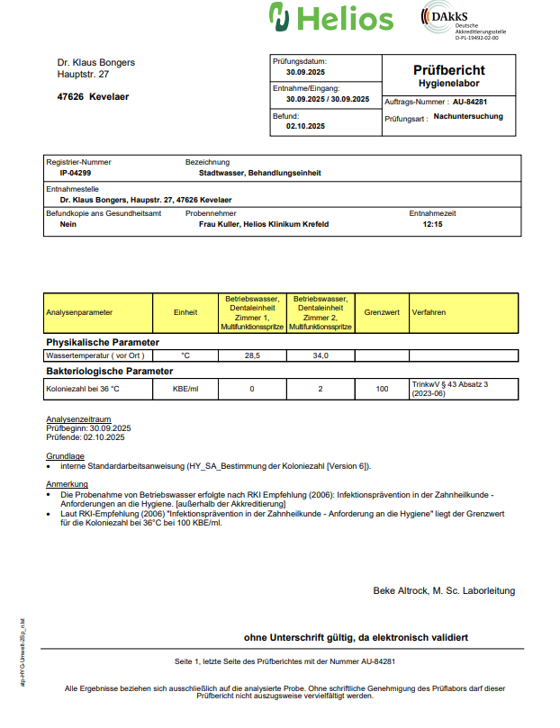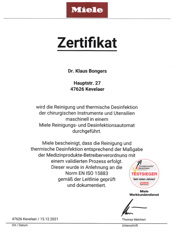 In unserer Praxis sind Ihre Sicherheit und Gesundheit unser oberstes Gebot. Um dies zu gewährleisten, unterziehen wir uns regelmäßigen Hygienekontrollen und sind stolz darauf, die höchsten Standards zu erfüllen. Durch diese Zertifizierung können Sie sicher sein, dass sämtliche Abläufe und Maßnahmen in unserer Einrichtung sorgfältig geprüft und optimiert werden, um ein hygienisch einwandfreies Umfeld für Ihre zahnärztliche Behandlung zu gewährleisten. Ihr Vertrauen in unsere Praxis ist uns wichtig, und die Zertifizierung für Hygienekontrollen unterstreicht unser Engagement für Ihre Sicherheit und Ihr Wohlbefinden bei jedem Besuch.